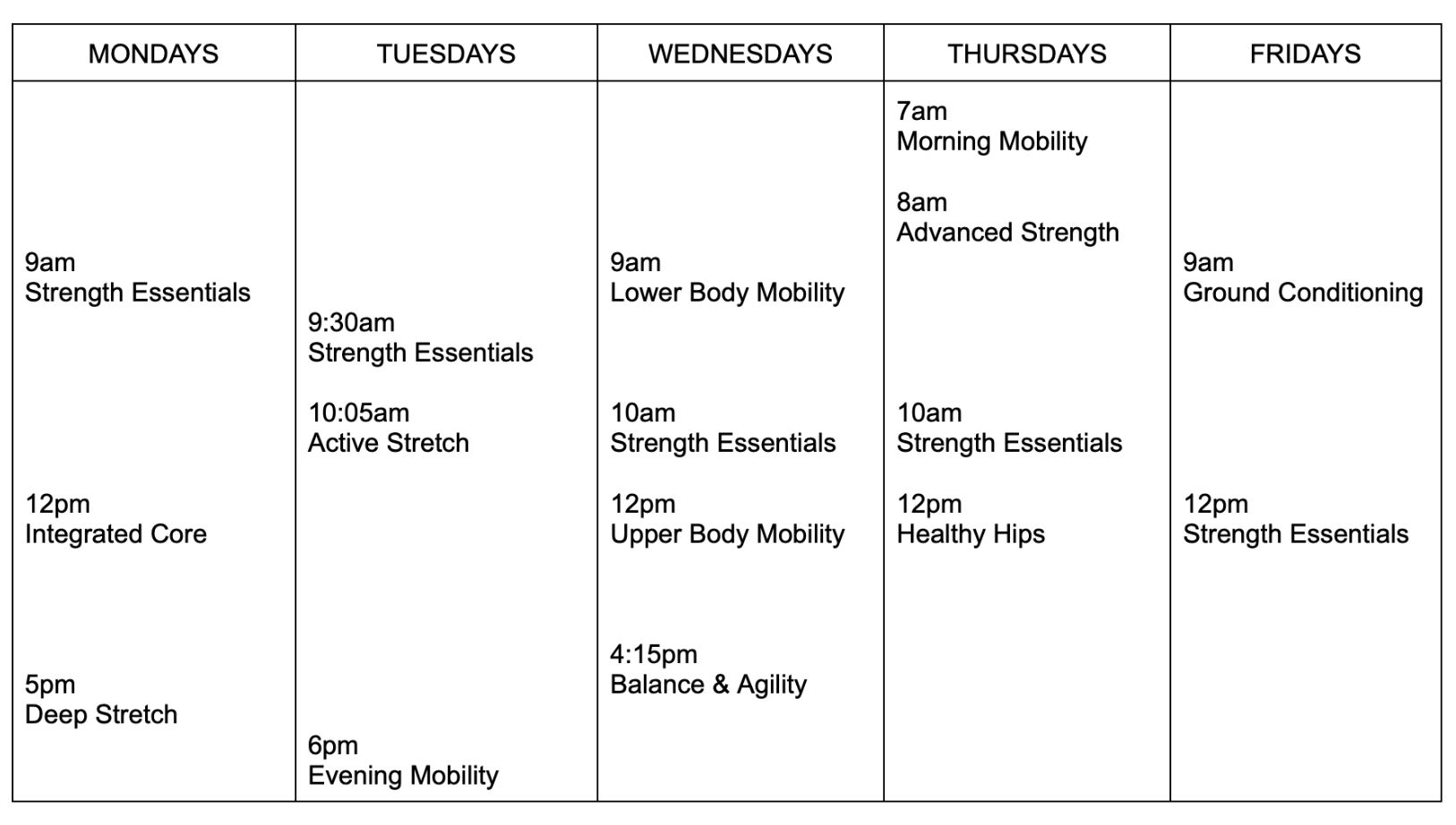 Don’t see a class at a convenient time for you? Let us know! We’re adjust class offerings, coaches, and times based on your needs.